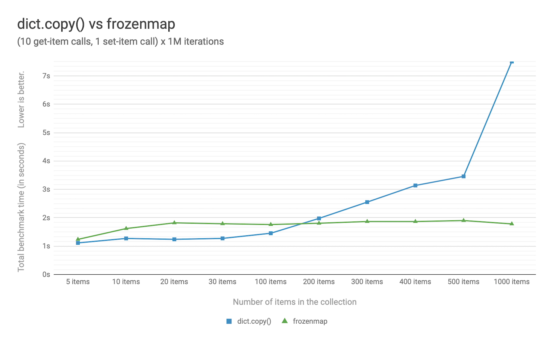 frozenmapimplemented with HAMT displays near O(1) performance for all benchmarked dictionary sizes.dict.copy()becomes less efficient when using around 100-200 items.
